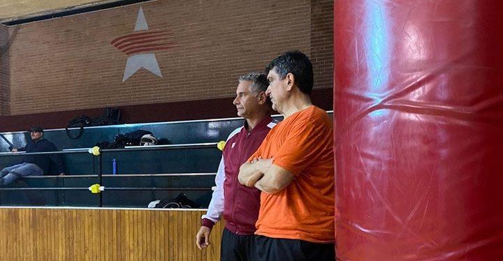 Nella fotografia Massimiliano Cannalire ascolta in silenzio un paio di consigli dal Campione d’Italia, d’Europa e del Mondo Stefano Sbarra, Playmaker del meraviglioso BancoRoma di Coach Valerio Bianchini.