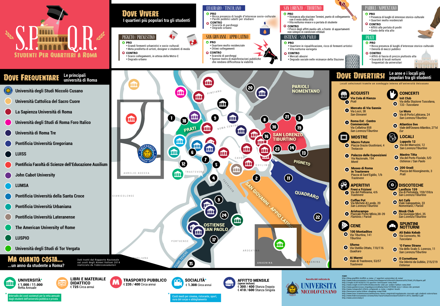 La nostra università lancia S.P.Q.R Studenti Per Quartieri a Roma, la mappa per gli universitari della Capitale. All’interno della mappa scaricabile è possibile rinvenire le sedi delle principali università romane, i locali più amati dagli studenti e i pro e i contro di ciascun quartiere universitario. Nell’illustrazione sono presenti anche dati interessanti su quanto costa un anno da studente a Roma. Scaricala subito, stampala e portala sempre con te!
