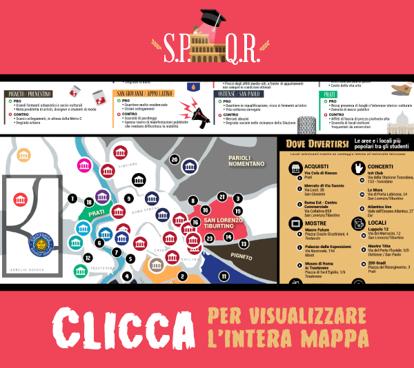 La nostra università lancia S.P.Q.R Studenti Per Quartieri a Roma, la mappa per gli universitari della Capitale. All’interno della mappa scaricabile è possibile rinvenire le sedi delle principali università romane, i locali più amati dagli studenti e i pro e i contro di ciascun quartiere universitario. Nell’illustrazione sono presenti anche dati interessanti su quanto costa un anno da studente a Roma. Scaricala subito, stampala e portala sempre con te!