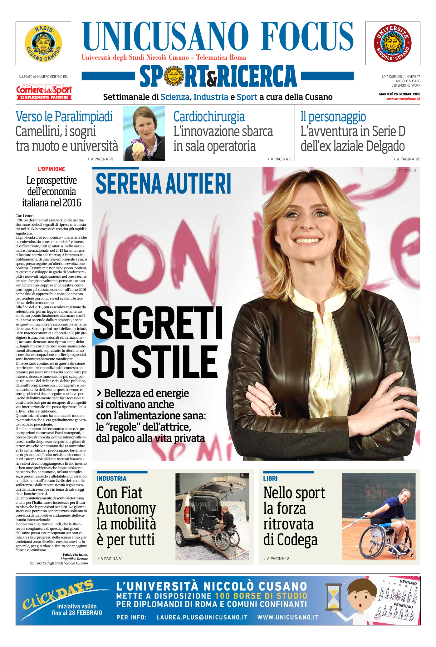 Unicusano Focus Sport&Ricerca del 26 gennaio 2016. Ricorda che Unicusano Focus Sport&Ricerca, il settimanale a cura dell’Università Niccolò Cusano, ti aspetta ogni martedì in edicola, allegato al Corriere dello Sport.