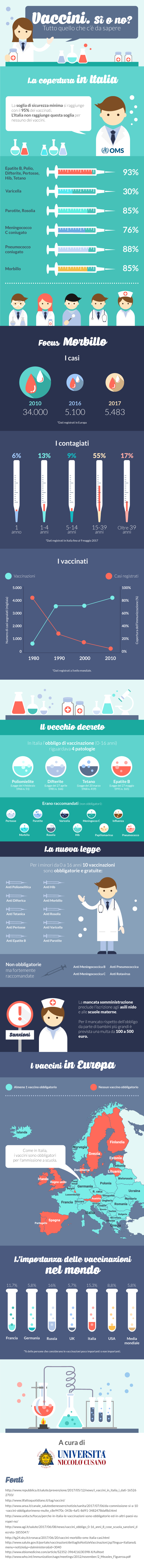 L’Università Niccolò Cusano lancia l’infografica “Vaccini: sì o no? Tutto quello che c’è da sapere”, nella quale viene fatta una panoramica generale sulla situazione della copertura vaccinale in Italia e nel mondo e, successivamente, le novità subentrate con la nuova legge rispetto alla situazione precedente.