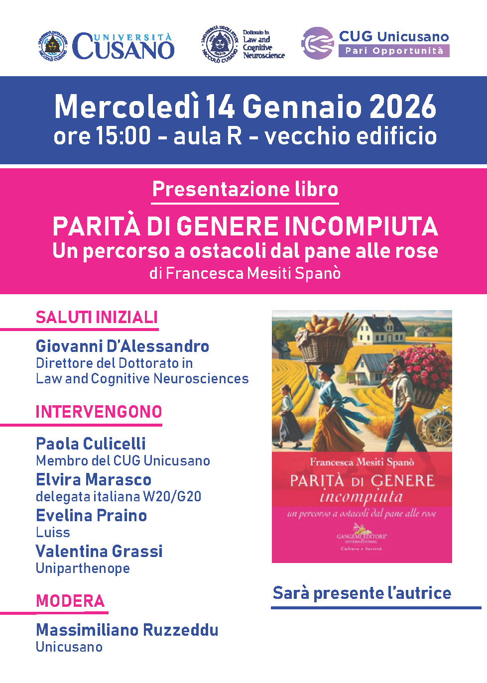 DATA EVENTO | 14 Gennaio 2026 LUOGO | aula R INDIRIZZO | via Don Carlo Gnocchi 3, 00166 - Roma Presentazione libro PARITÀ DI GENERE INCOMPIUTA Un percorso a ostacoli dal pane alle rose di Francesca Mesiti Spanò Scarica la locandina