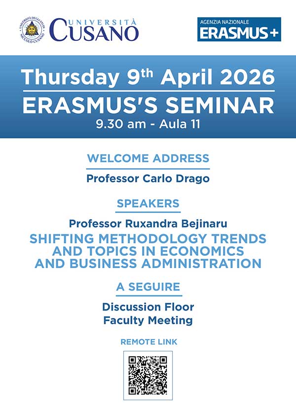 DATA EVENTO | 9 Aprile 2026 LUOGO | Aula 11 | ore 9.30 INDIRIZZO | Via Don Carlo Gnocchi 3 - Roma Erasmus’s seminar