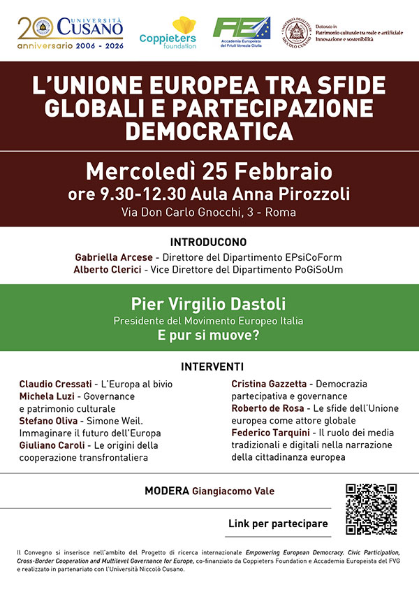 DATA EVENTO | 25 Febbraio 2026 LUOGO | Aula Anna Pirozzoli | orer 9.30 INDIRIZZO | Unicusano L’Unione Europea tra sfide globali e partecipazione democratica