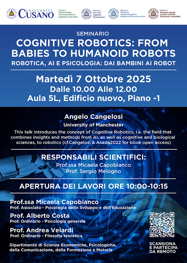 07/10/2025 Seminario Cognitive Robotics: From Babies to Humanoid Robots Per accedere da remoto servizi.unicusano.it Angelo Cangelosi University of Manchester…