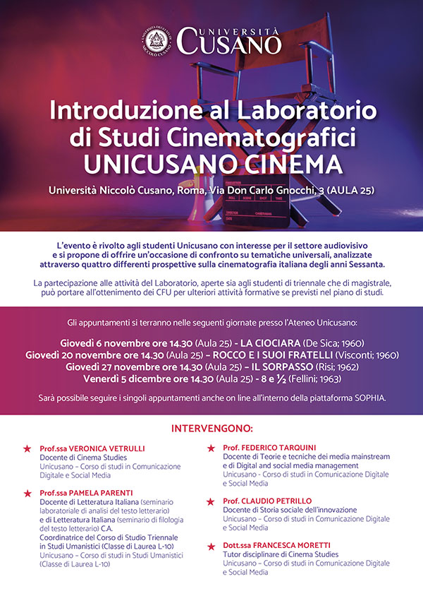 06/11/2025 Introduzione al Laboratorio di Studi Cinematografici Unicusano Cinema L’evento è rivolto agli studenti Unicusano con interesse per il…