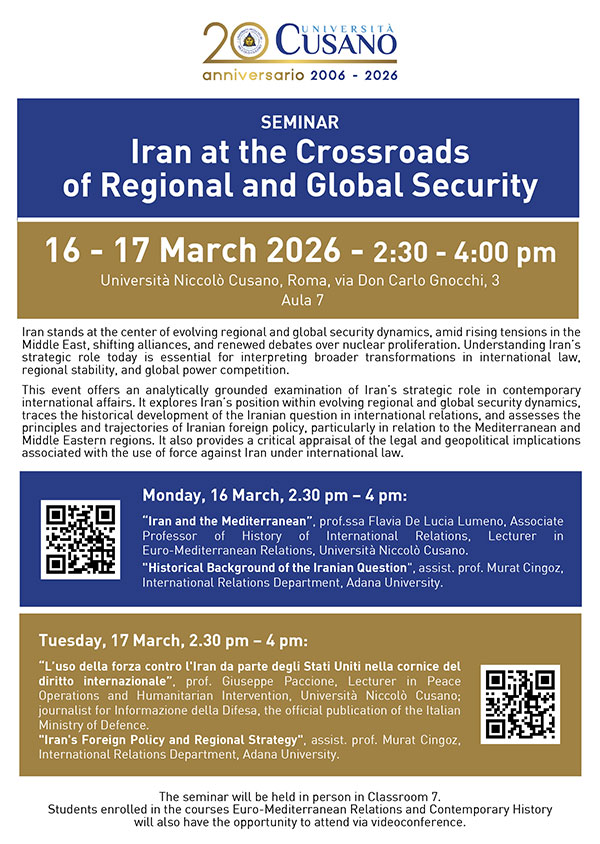 The seminar will be held in person in Classroom 7. Students enrolled in the courses Euro-Mediterranean Relations and Contemporary History will also have the opportunity to attend via videoconference.