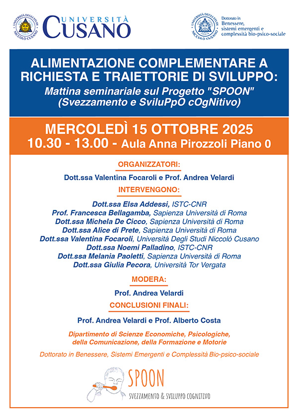 DATA EVENTO | 15 Ottobre 2025 LUOGO | Aula "Anna pirozzoli" Piano 0 | ore 10.30 INDIRIZZO | Unicusano Seminario Alimentazione complementare a richiesta e traiettorie di sviluppo