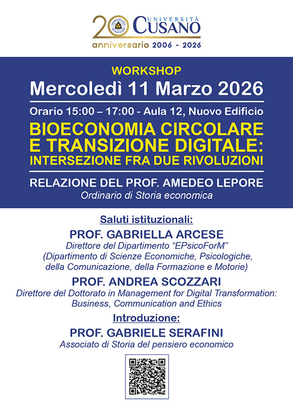 DATA EVENTO | 11 Marzo 2026 LUOGO | Aula 12 | ore 15.00 INDIRIZZO | Unicusano Workshop: Bioeconomia circolare e transizione digitale: intersezione fra due rivoluzioni